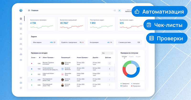 CheckOffice — сервис электронных чек-листов, в котором удобно работать с проверками, задачами и нарушениями. В CheckOffice можно создавать чек-листы, планировать и проводить проверки в мобильном приложении, фиксировать нарушения и ставить задачи на их устранение. Все данные хранятся в одном месте — их можно анализировать с помощью отчетов.
